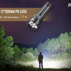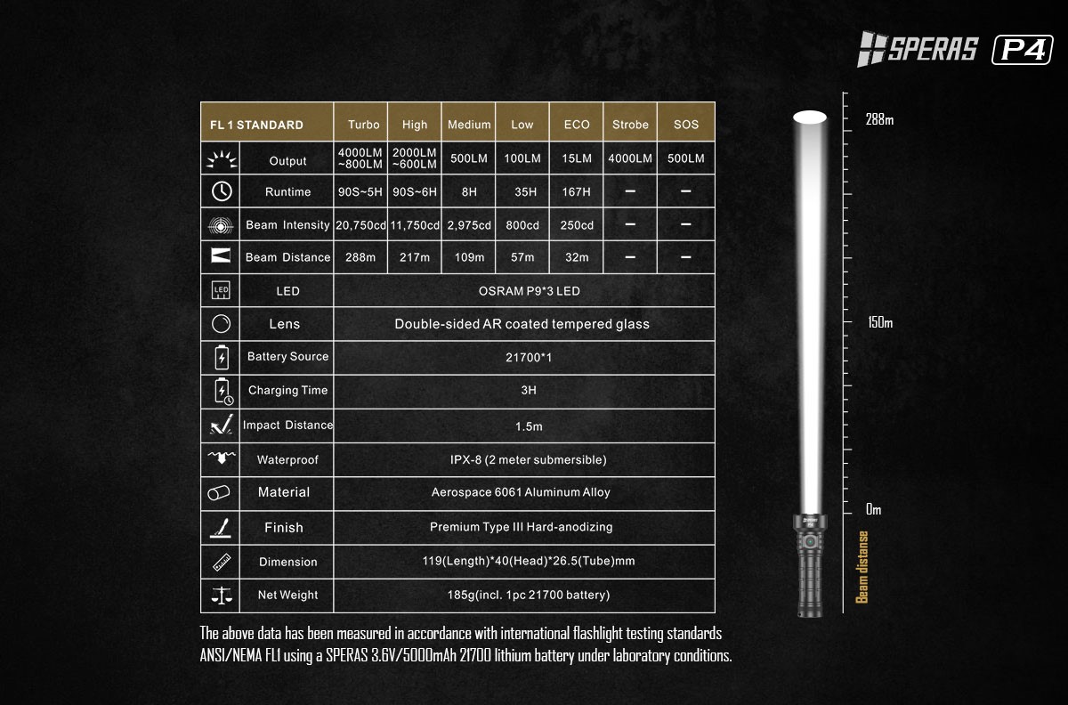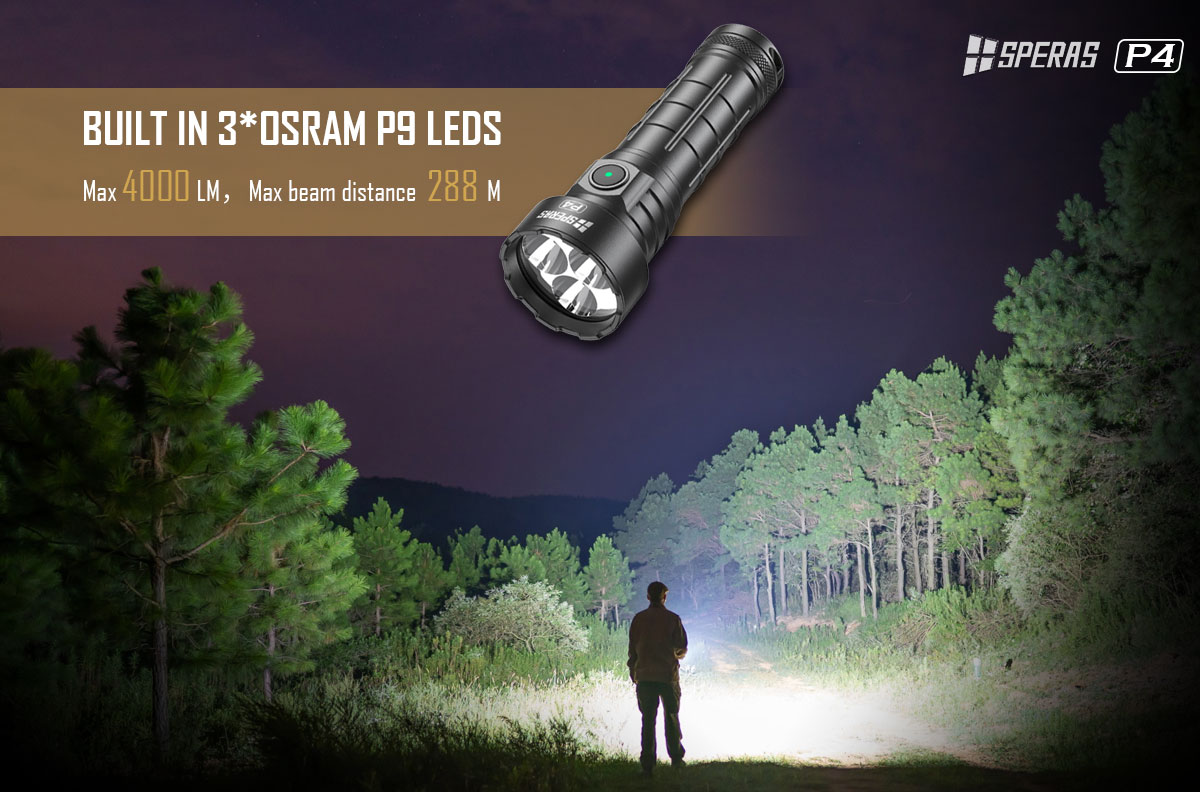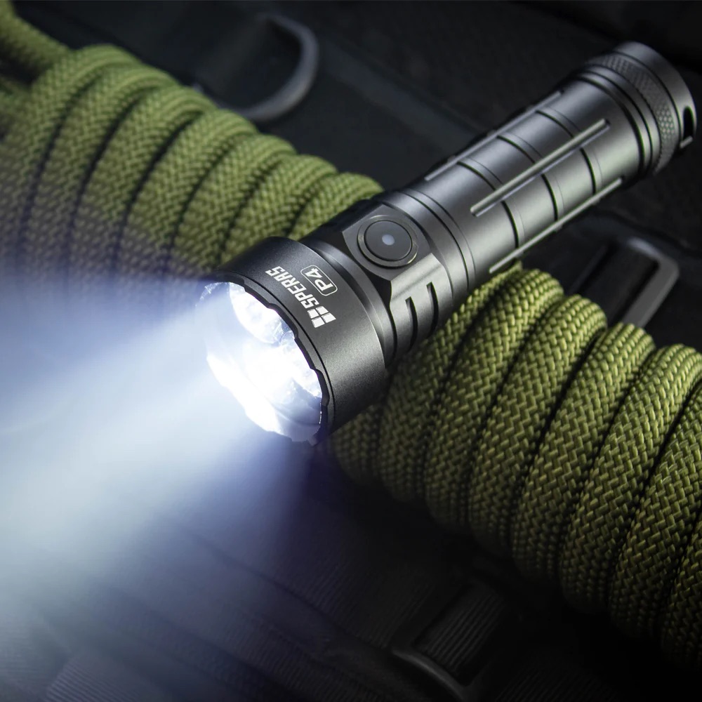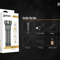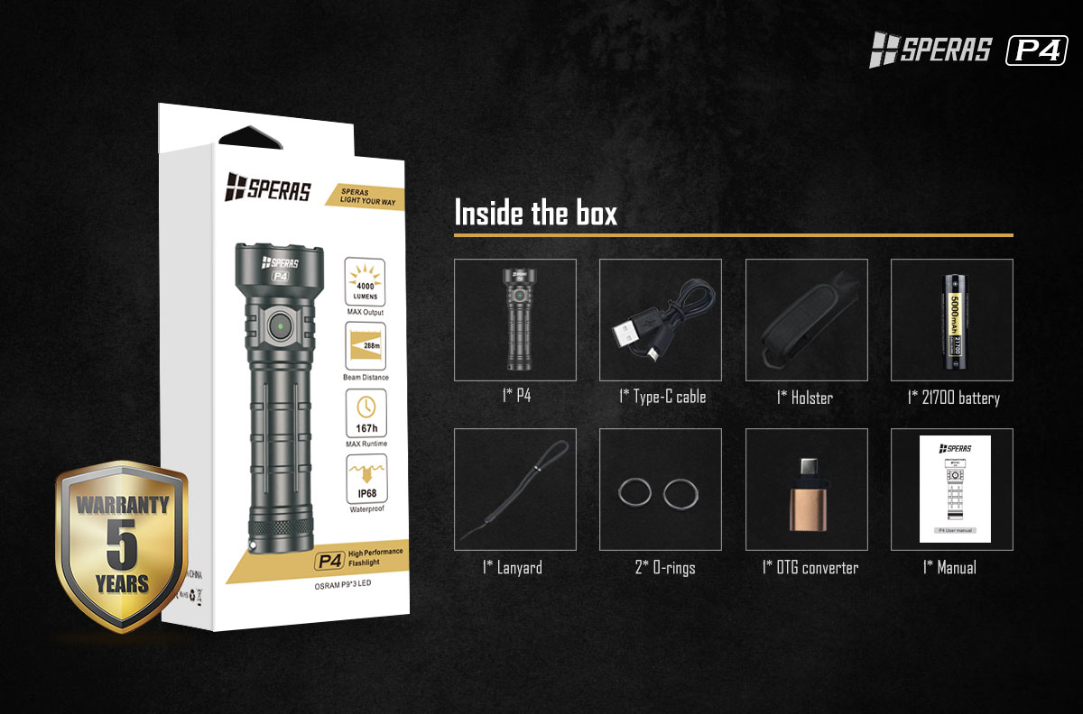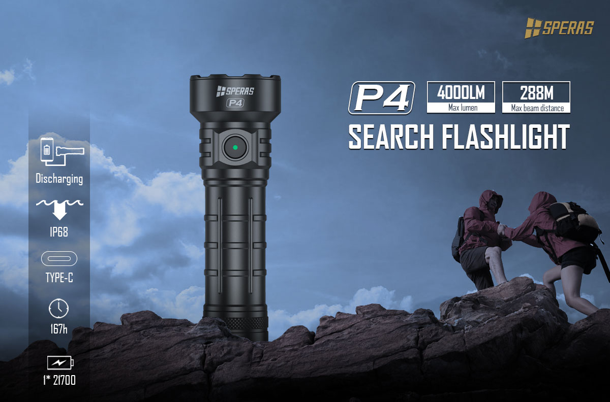 The SPERAS P4 is a powerful, rechargeable, side-switch LED flashlight, powered by a 21700 lithium battery (5000mAh). The P4 is equipped with 3 OSRAM LEDs which provide a 4000lumen output and a 288m beam distance. With the compact size and functional user interface, it’s an ideal flashlight for search and rescue and other outdoor activities. With the Lock function, users can be assured that the flashlight will not unintentionally power on in their pockets or bag.